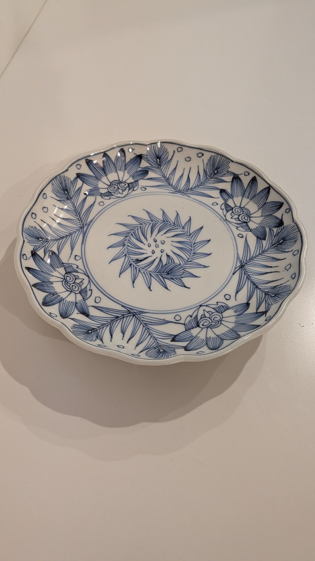 淡い呉須で描かれた菊唐草紋。 見込みには五弁の可憐な花が。 糸底の中心に壽字紋。 小振りながらさながら大皿のような風格です。 おおきさは様々です。 大きいものは 直径10.5cm、高さ2.5cm 小さいものは直径10cm、高さ2..5cm,
