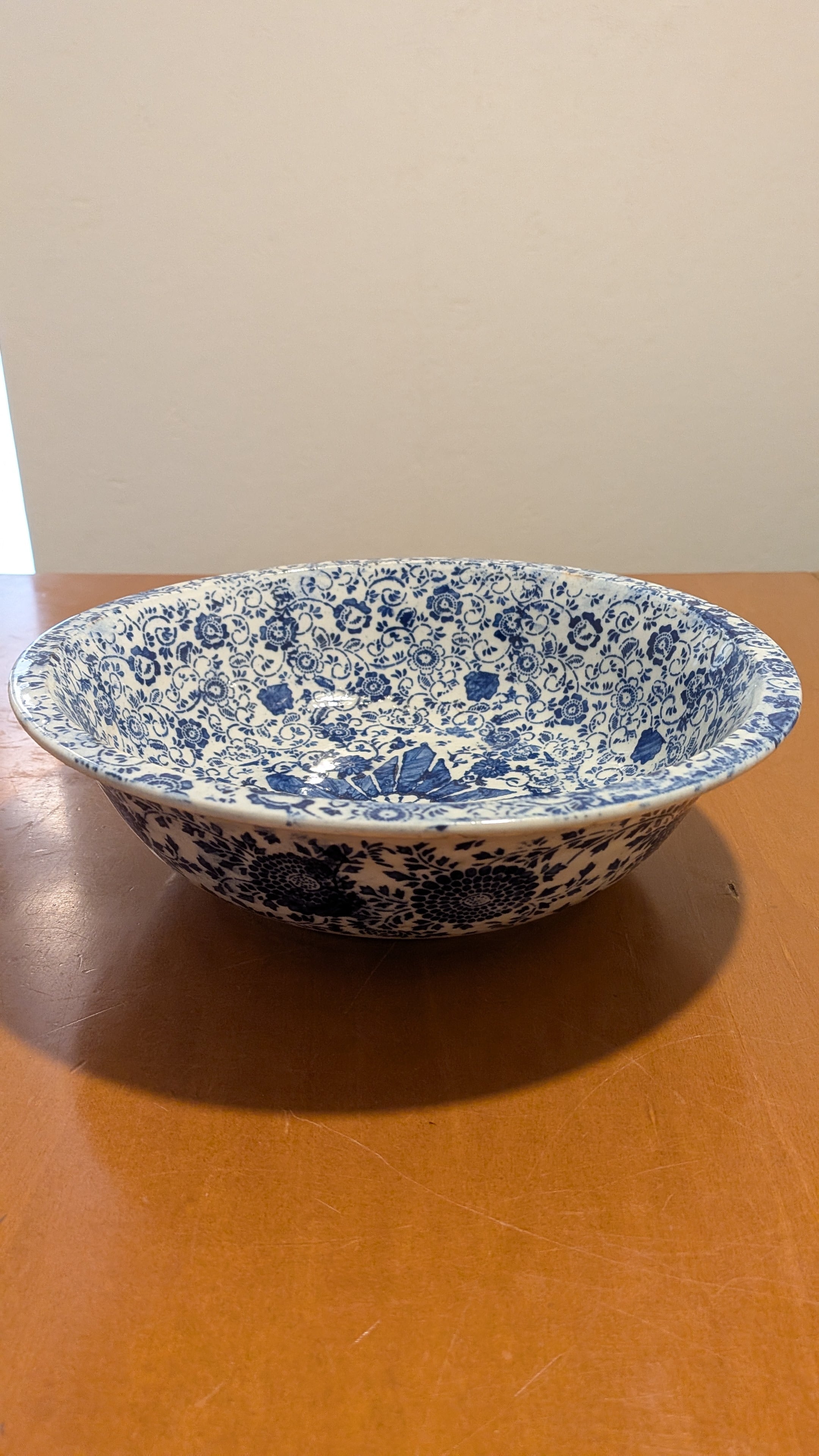 明治に入ってからのベロ藍の鉢です。ベロ藍の鉢にしては薄手です。ところどころ印判のうすいところもあります。見込みは五稜の星形。品の良い姿ですね。どんな御料理にも合いそうです。