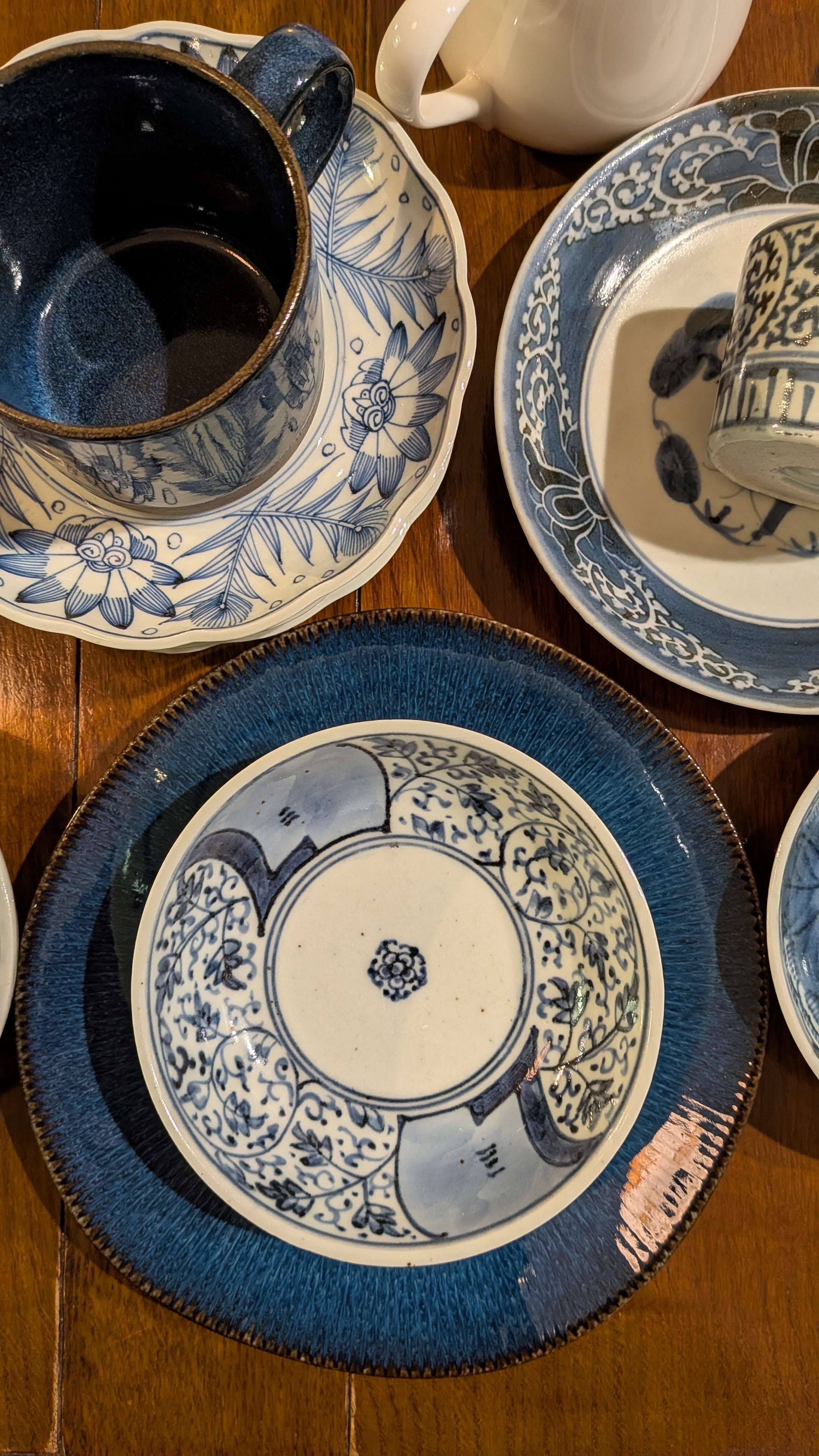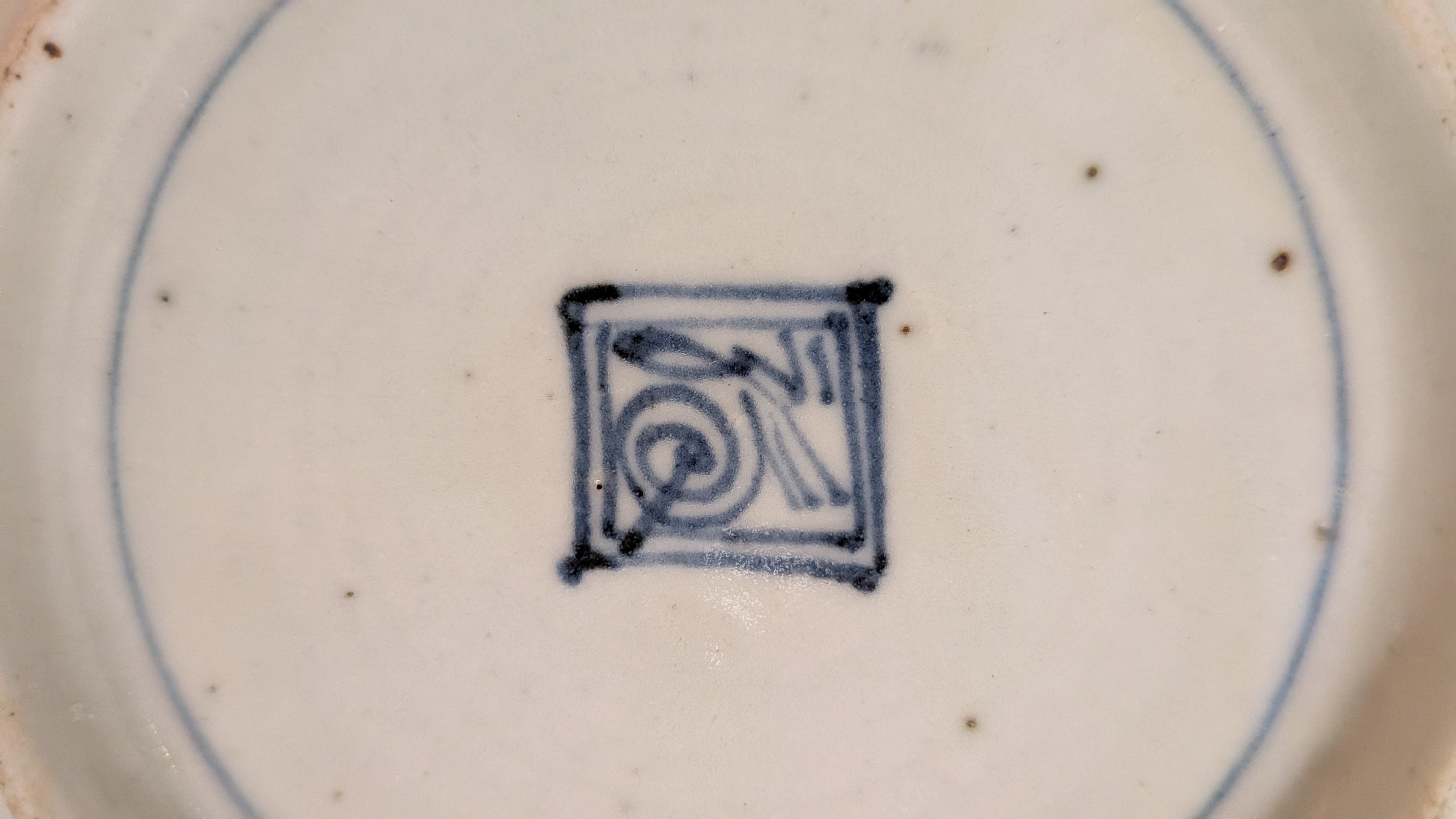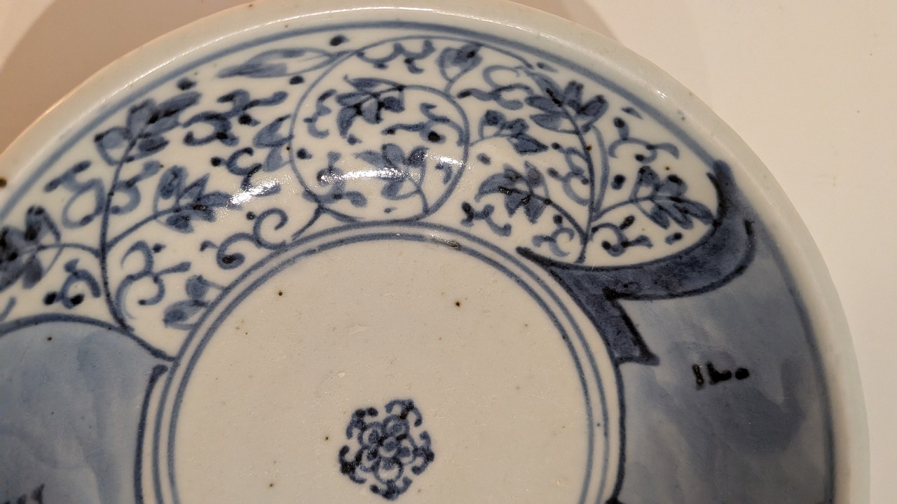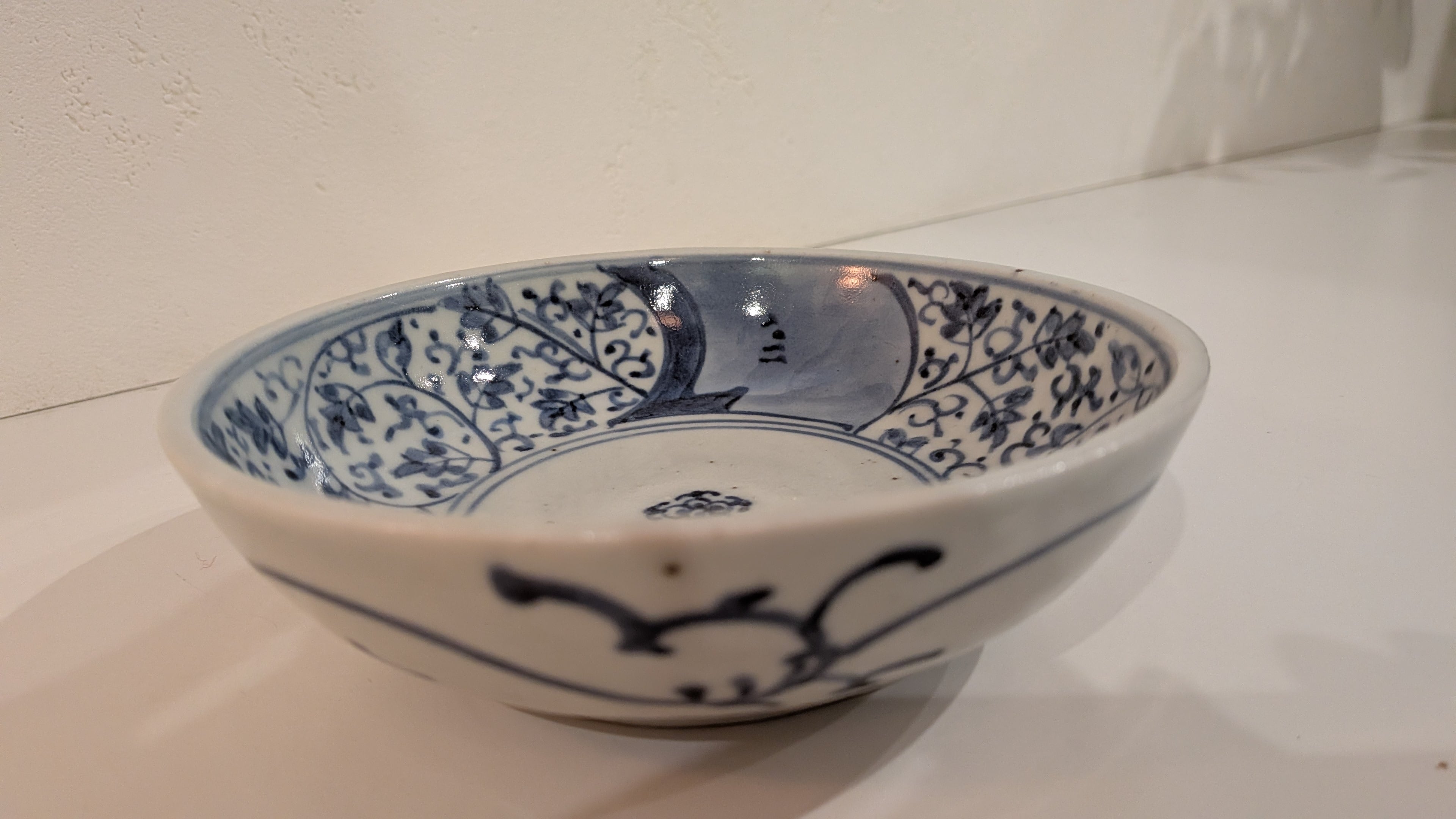 萩唐草をふたつに割っている図柄は何でしょうね。和綴じの本?瓦?建物から覗く海?色々空想してみてください。見込みは五弁花の窯印です。裏面には角福。生地はぼってりした厚め。